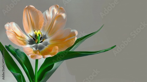 © Anna, Fototapeta premium A yellow flower in a glass vase on a white table against a gray wall