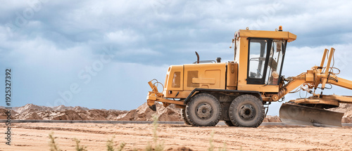 © Anoo, Obraz premium A yellow grader is actively leveling the sandy terrain at a construction site while dramatic clouds loom in the sky during late afternoon