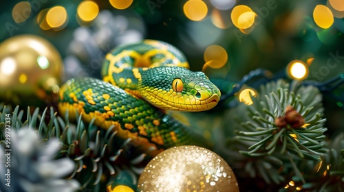 © Andrei, Fototapeta premium A yellow-green snake crawls on a Christmas tree with New Year's toys