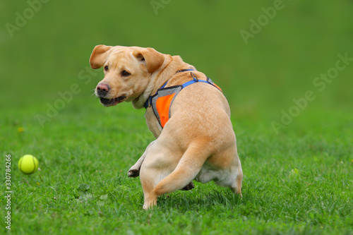 © Dixi_, Obraz premium A yellow labrador runs after a toy along the grass