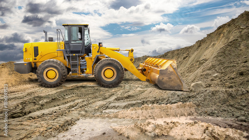 © Anoo, Obraz premium A yellow loader is seen digging and moving soil at a construction site under a dramatic sky filled with clouds on an overcast afternoon