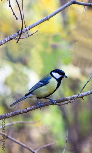 © Анастасія Мурко, Fototapeta premium A yellow on a branch in a city park. Small yellow feathered animal resting on tiny twig.