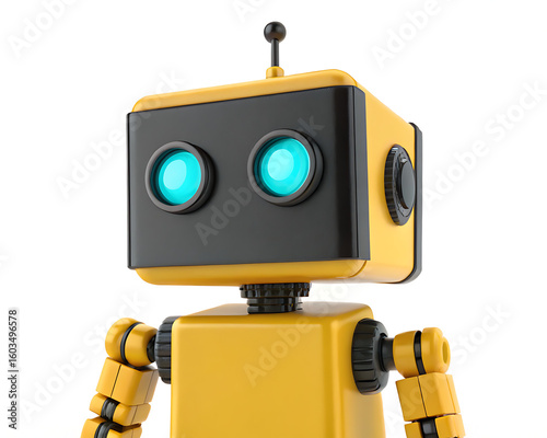 © jamal, Fototapeta premium A yellow robot with a black face and two glowing blue eyes standing on a white background close up