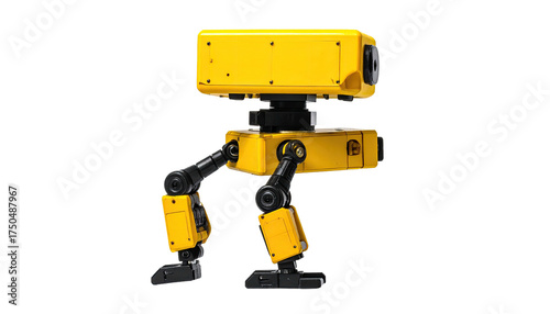 © Helena, Fototapeta premium A yellow robot with legs, boxes, and multiple joints. Stands against a black background