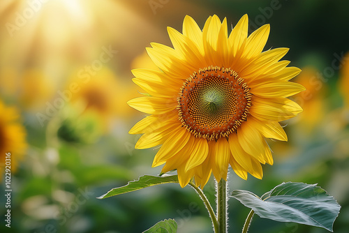 © Varitnan, Fototapeta premium A yellow sunflower is the main focus of the image, surrounded by green leaves