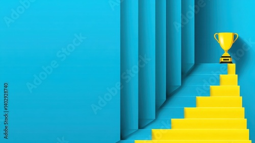 © KohXD, Obraz premium A yellow trophy floating above a podium step on a blue background symbolizing achievement, success, and recognition