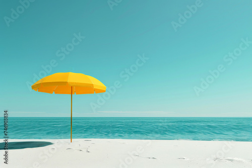 © Phichitpon, Fototapeta premium a yellow umbrella sitting on top of a sandy beach under a blue sky. generative ai