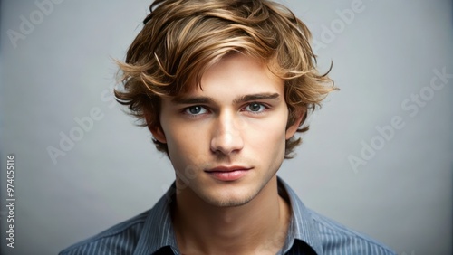 © Arnada, Naklejka premium A young adult male with light brown hair, styled with a subtle wave, looks directly at the camera
