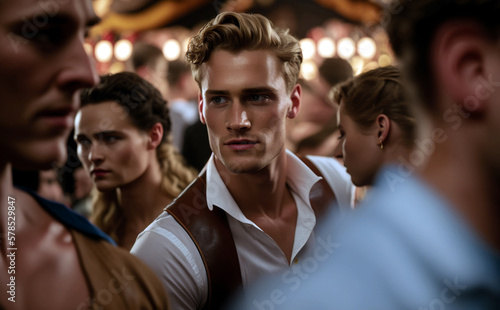 © wetzkaz, Fototapeta premium a young adult man in a beer tent in munich at the oktoberfest, wears a typical traditional shirt, many other beer tent visitors are in the beer tent. Generative AI