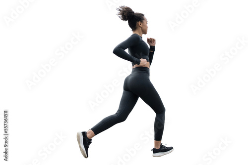 Obraz premium A young adult woman is running in sportswear and sneakers, isolated transparent background.