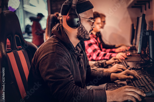 © Fxquadro, Obraz premium A young African American guy, enjoying spending time with his friends, playing in a multiplayer video game on a PC in a gaming club or internet cafe.