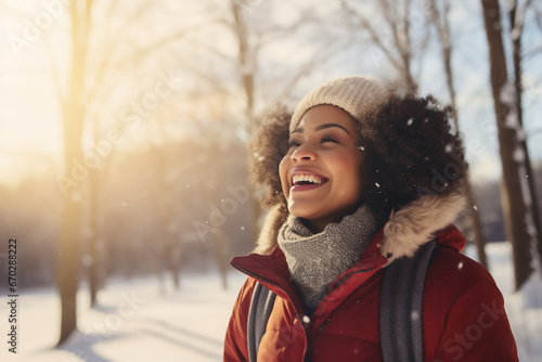 Obraz premium A young african american woman is playing in the snow happily with a winter...