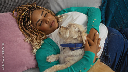 Obraz premium A young african american woman with braids is relaxing indoors on a couch in her living room, cuddling her small dog closely.