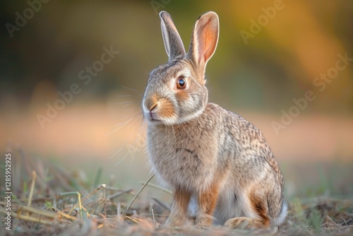 Fototapeta premium A young, alert wild rabbit sits in a field of dry grass, basking in the warm,...