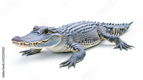 © A4719, Naklejka premium A young alligator, dark gray and speckled, is seen from above against a bright white background. Its textured skin and clawed feet are visible.