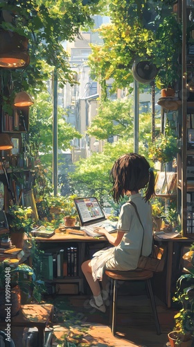Naklejka premium A young Asian girl surrounded by plants, deeply focused on her laptop in a...