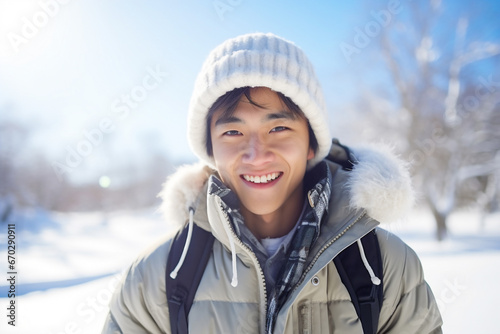 © pangamedia, Fototapeta premium A young asian male is playing happily with the snow with in a winter coat with a winter hat in a in snow covered country landscape during day in winter on a bright and sunny day