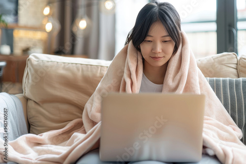© Sunday Cat Studio, Naklejka premium A young Asian woman enjoys cozying up with a laptop while wrapped in a soft blanket at home, creating a warm and inviting atmosphere.