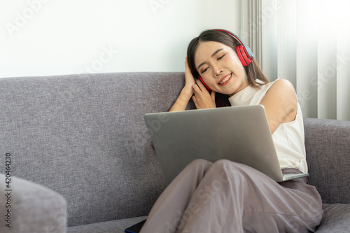Naklejka premium A young Asian woman is happily relaxing listening to music through wireless headphones while at home on vacation.