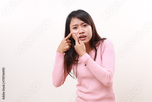 Fototapeta premium A young asian woman popping a pimple on her face while looking at the camera. Isolated on white