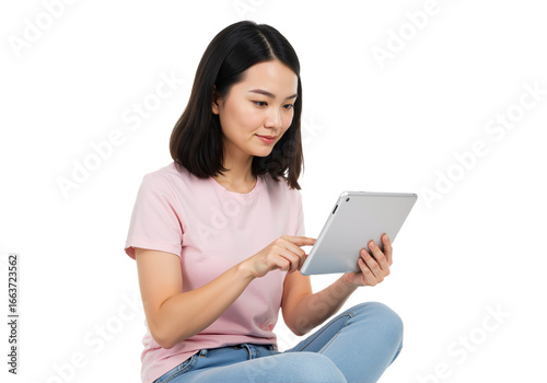 © Hicham, Fototapeta premium A young Asian woman sitting cross-legged, happily engaging with a tablet on a transparent background