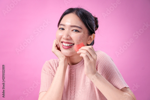 Fototapeta premium A young Asian woman with dark hair in a bun, wearing a ribbed pink...