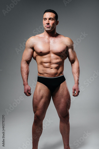 © Andrii, Fototapeta premium A young athlete bodybuilder poses in the studio topless, showing off his abs and muscles. Sport.