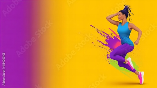 © Raul, Naklejka premium A young, athletic woman of color in vibrant activewear jumps across a yellow background with paint splatters.