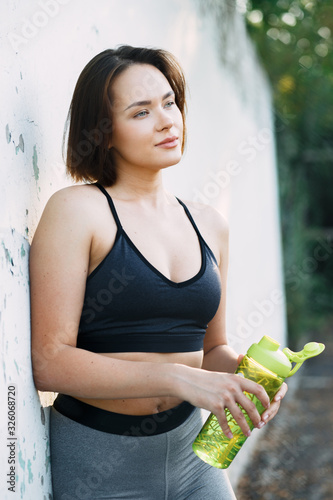 © Дарья Фомина, Obraz premium a young attractive girl in sportswear on the Playground holding a sports water bottle in the summer