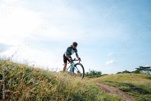 Obraz premium A young bearded cyclist is biking through a field