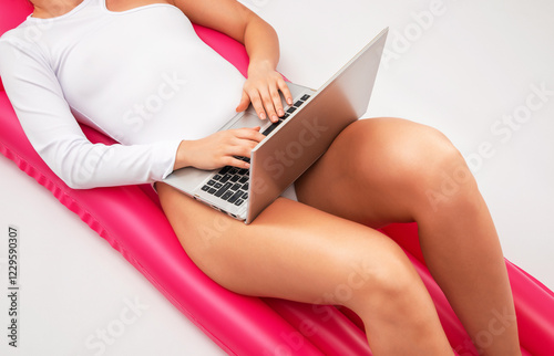 © Dimid, Naklejka premium A young beautiful girl in a white swimsuit lies on a pink inflatable mattress and works on a laptop.