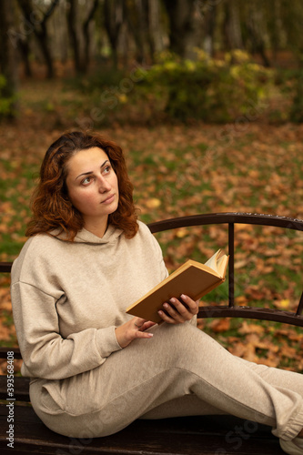 Obraz premium a young beautiful girl is sitting on a bench in an autumn Park, reading a book