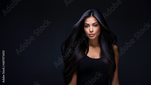 Fototapeta premium A young black haired woman poses for the camera against a black background.