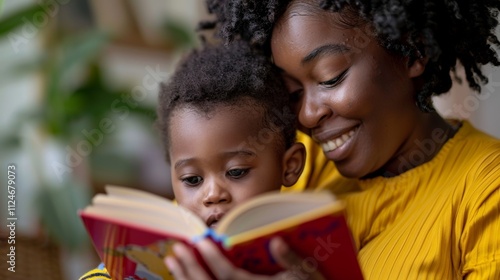 Fototapeta premium A young black mother and her child are engaged in a heartwarming reading...