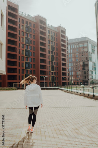 Naklejka premium A young blonde sports girl in a black suit runs along modern houses