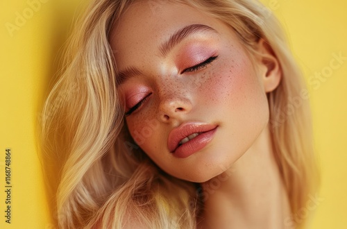 © Kien, Fototapeta premium A young blonde woman with pink eye shadow and a yellow background, a close-up of her face, showcasing makeup