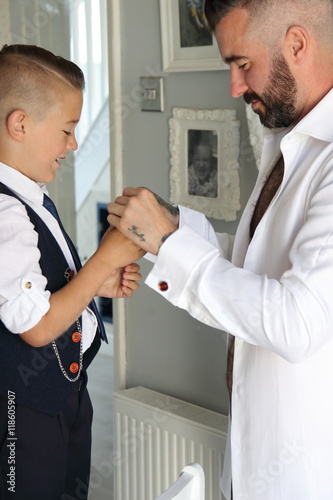 Obraz premium A young boy dressing his father on his wedding day as part of his best man...