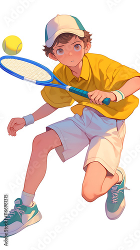 © Robin, Obraz premium A young boy in a yellow shirt playing tennis, poised to hit a ball with a racket.