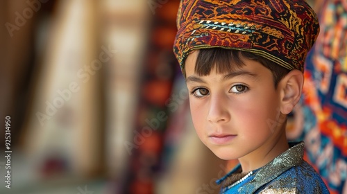 Fototapeta premium A young boy in traditional clothing and an ornate hat with patterns gazes...
