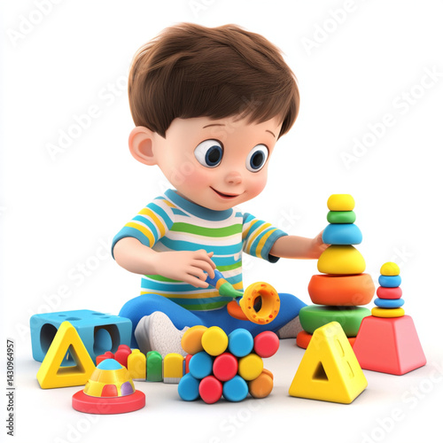 © la, Obraz premium A young boy is deeply engaged in playing with colorful shapes and stacking rings, fostering creativity and development.