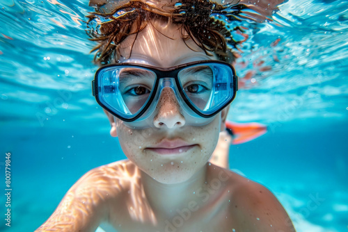 © Phichitpon, Fototapeta premium A young boy is swimming in a pool wearing goggles.ai generative