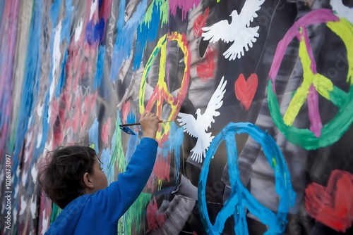 Obraz premium A young boy joyfully paints a peace sign on a wall, covering war imagery with colorful symbols of peace and love.