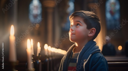 Naklejka premium A young boy looks with wonder in a church, illuminated by candlelight, with a...