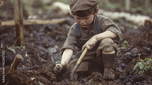 Naklejka premium A young boy mimicking his fathers actions trying his hand at ting peat for...