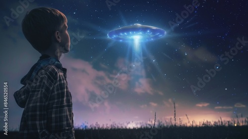 © neirfy, Fototapeta premium A young boy sees a glowing UFO in the dark, magical starry landscape, feeling astonishment, curiosity, and wonder