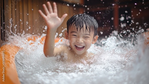 © Selvi, Obraz premium A young boy smiles with joy as he splashes in a water slide.