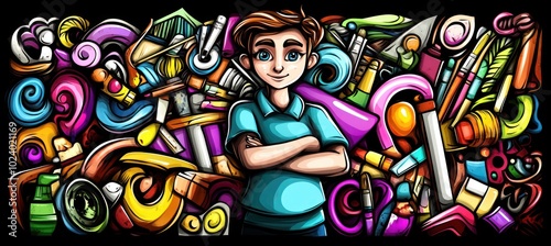 © BerkahStock, Obraz premium A young boy stands confidently amidst a colorful array of art supplies and creative tools.