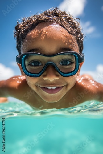 © Albert, Naklejka premium A young boy wearing a pair of swimming goggles in the water
