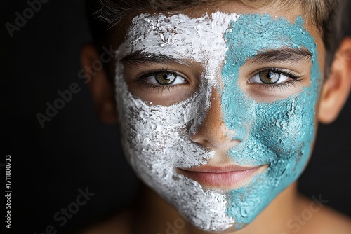 © Uro, Fototapeta premium A young boy with a painted face, showcasing a mix of white and turquoise colors, gazes confidently at the camera against a dark background.