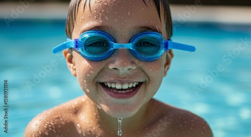 © Cintia, Naklejka premium A young boy with blue goggles emerges from a swimming pool, his face covered in water droplets, beaming with a happy smile.